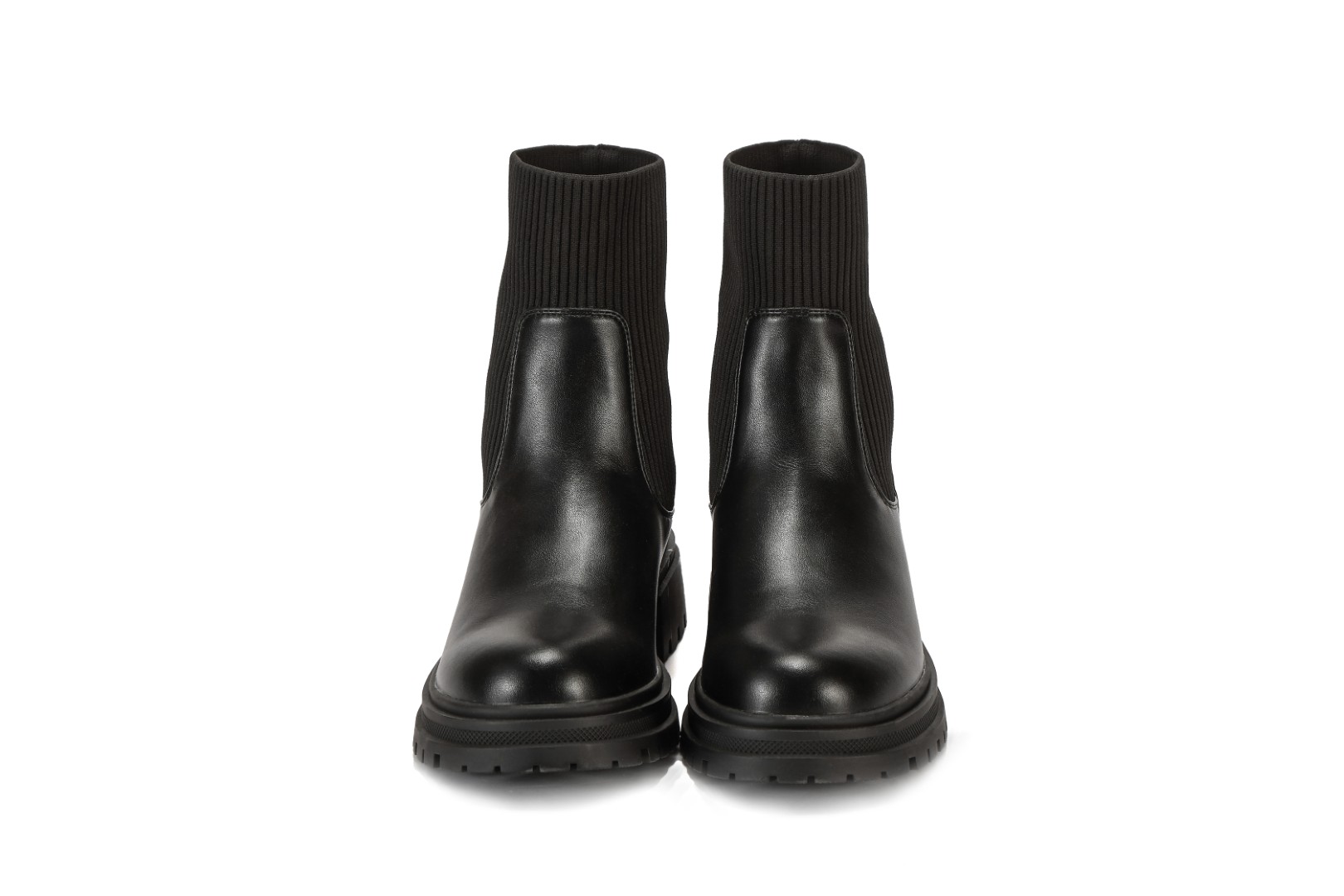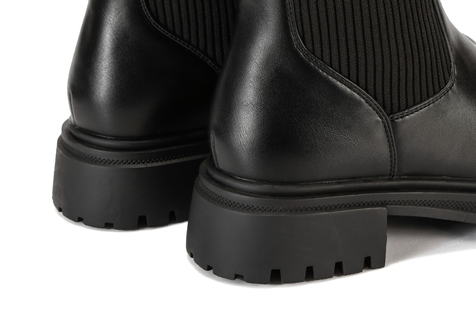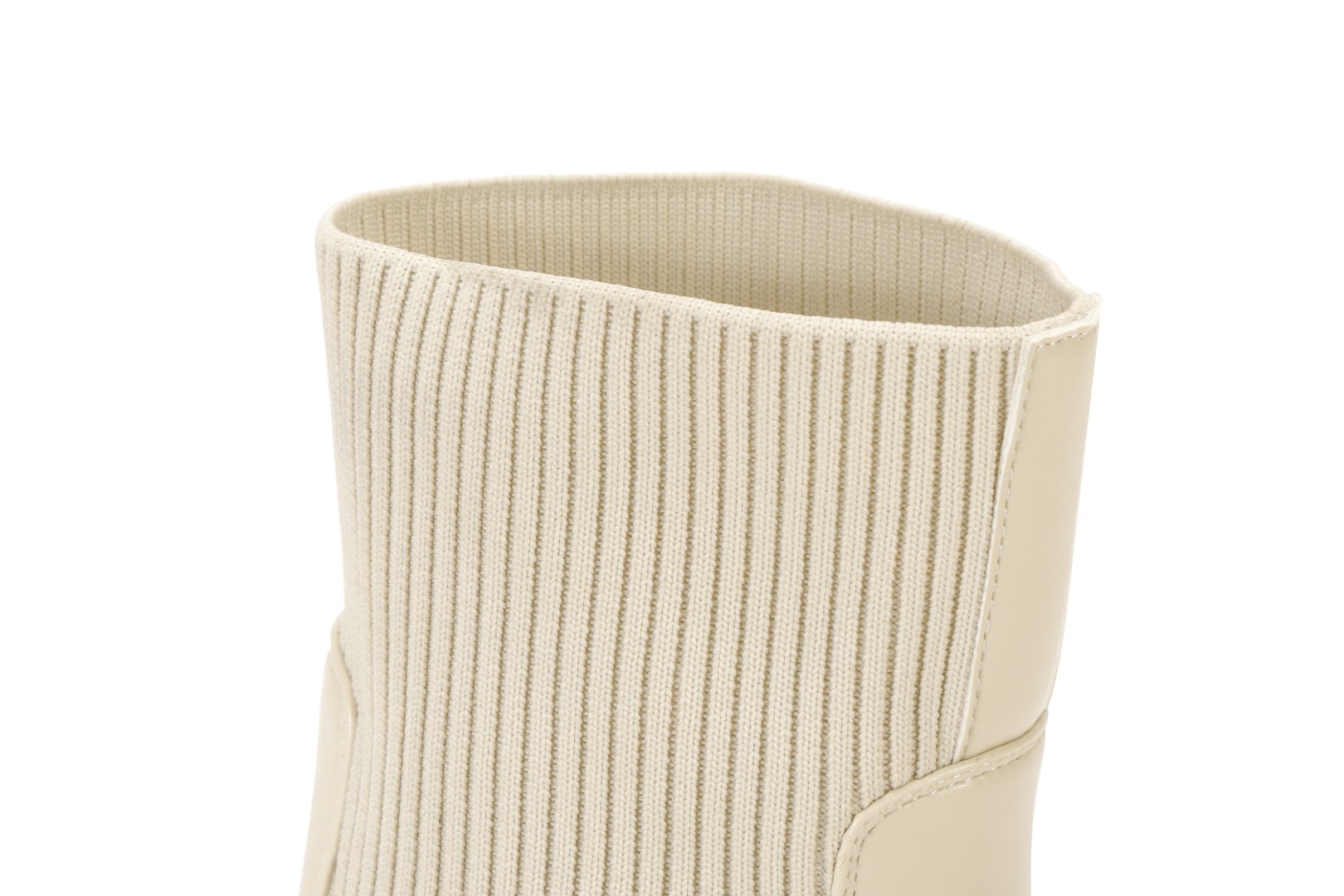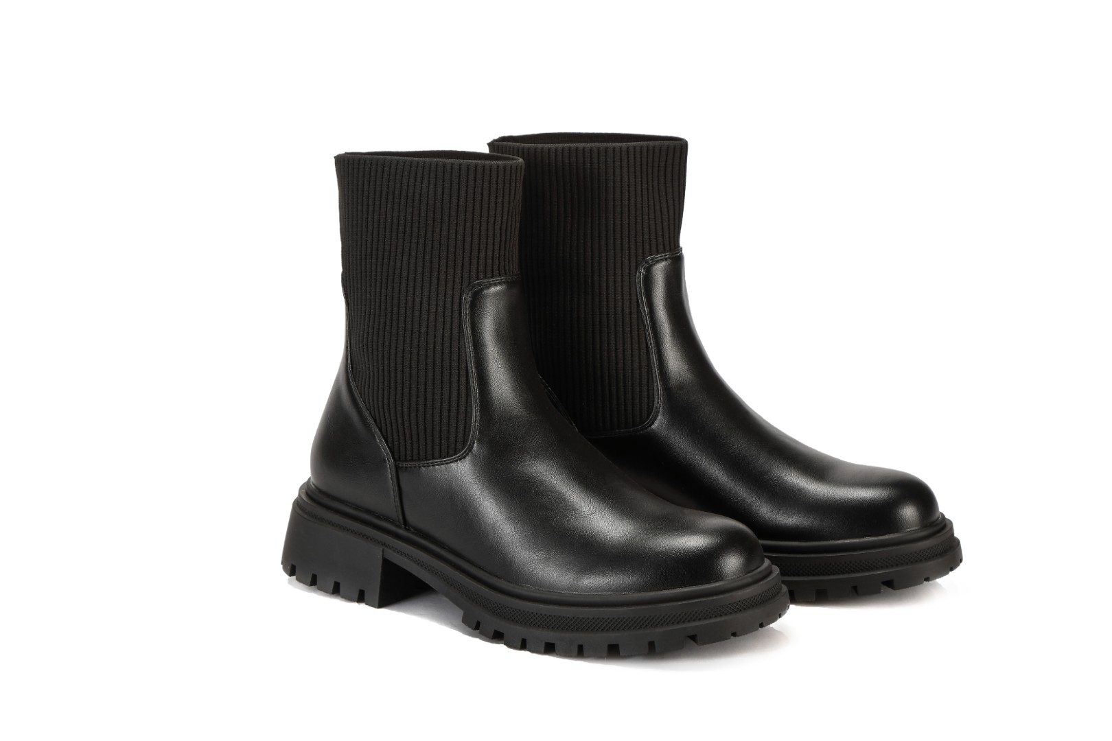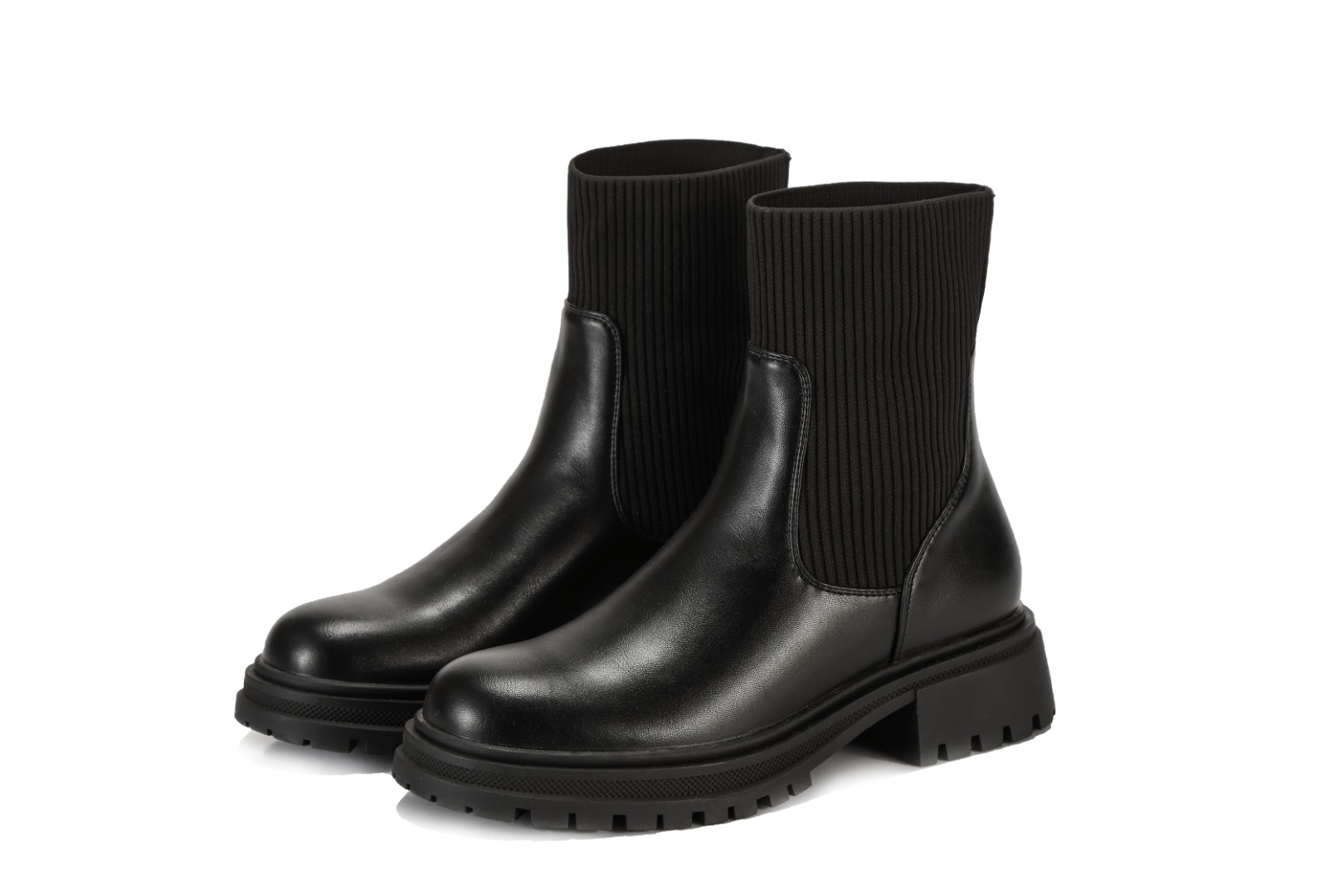 Step out in style and comfort with these Ladies' Knit-Collar Winter Boots. This model features a modern sock-boot aesthetic, combining a durable PU lower section with a flexible ribbed textile collar that hugs the ankle for a snug, cozy fit.