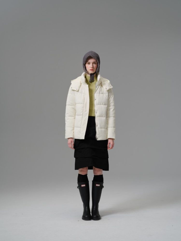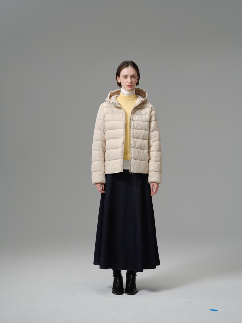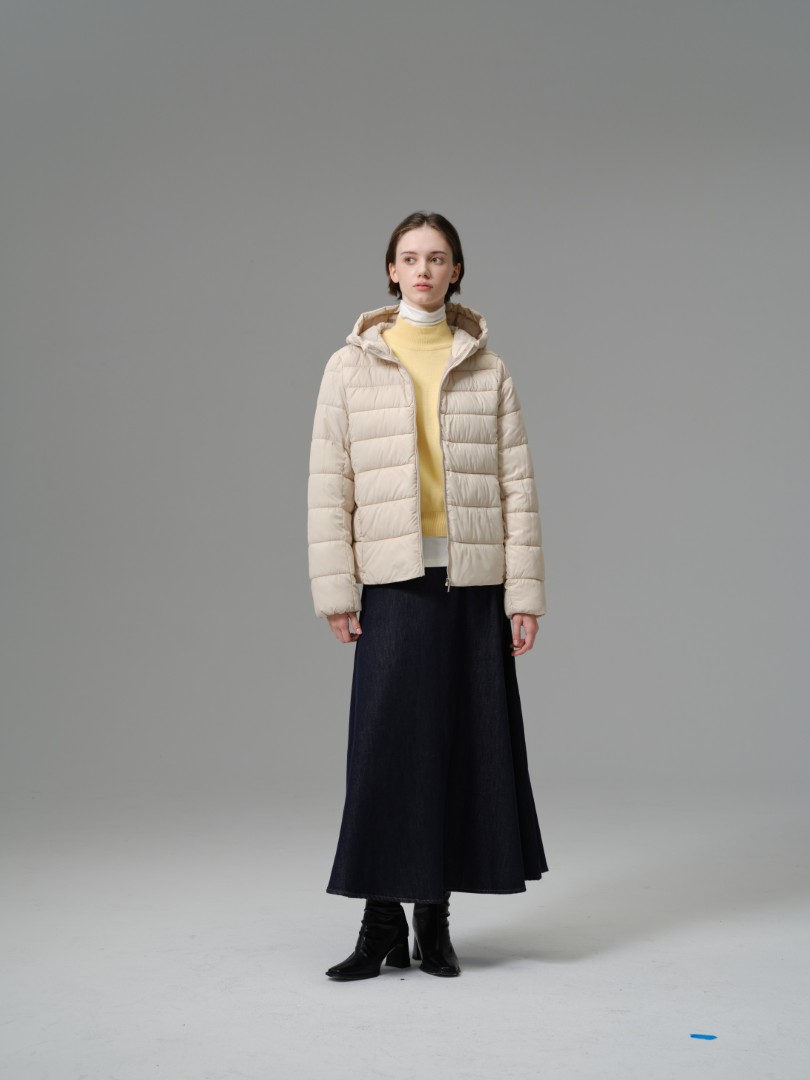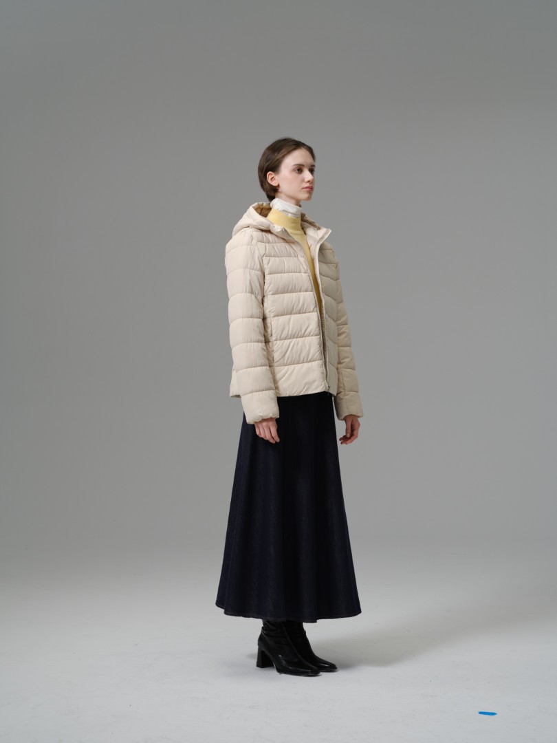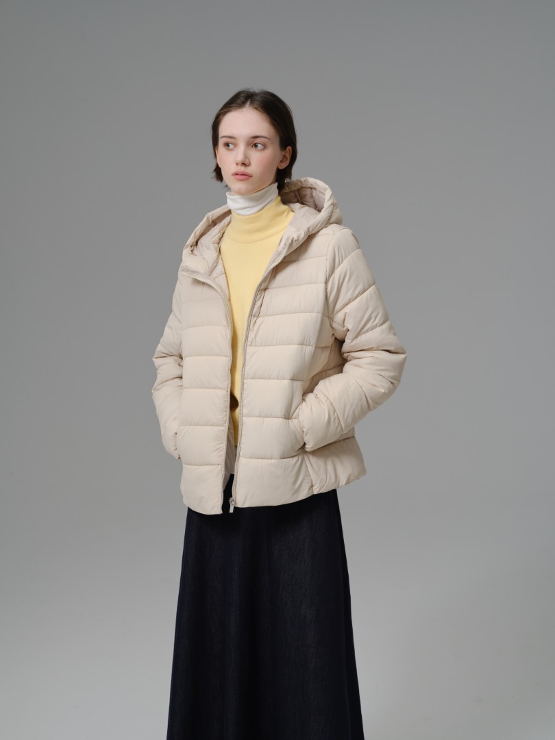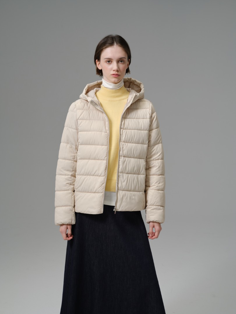 A highly versatile and light-as-air jacket perfect for layering across seasons. This piece utilizes a fine 100% polyester shell and fill with delicate horizontal quilting, providing insulation without the bulk. The design is neat and simple, featuring a practical hood and a comfortable, slightly fitted silhouette that hits at the hip. Its minimalist style and warm construction make it an excellent standalone outer layer or a functional mid-layer under a heavier coat.