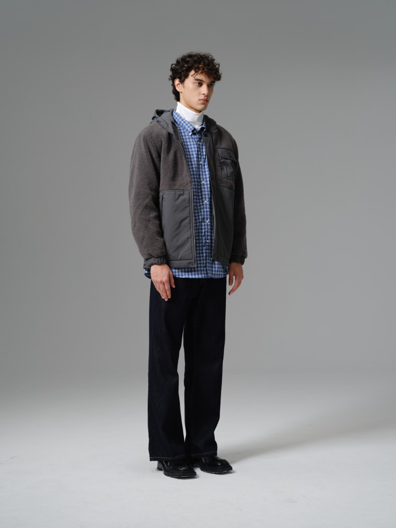 Featuring a high stand collar and a practical hood for added protection, the design offers superior warmth retention. The mixed media construction, which includes utility-style chest and side patch pockets, provides both visual interest and ample storage. Its straight-cut fit ensures easy layering over shirts and sweaters, making it the ideal staple for both travel and daily cool-weather wear.