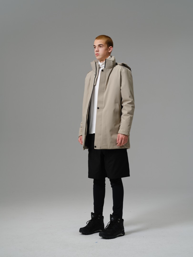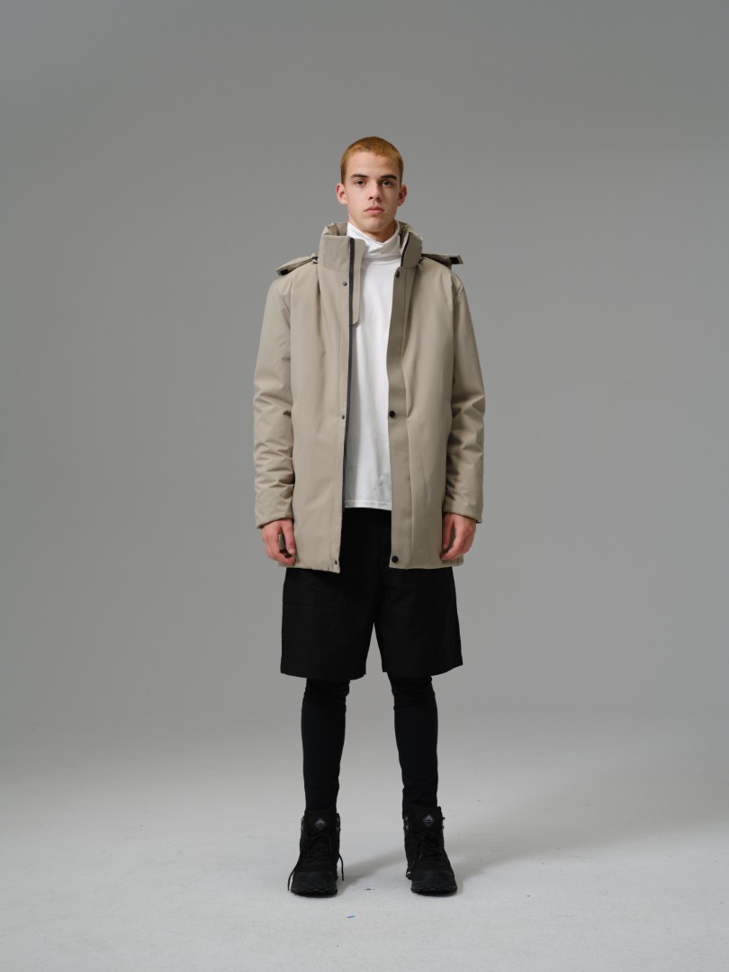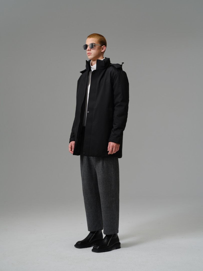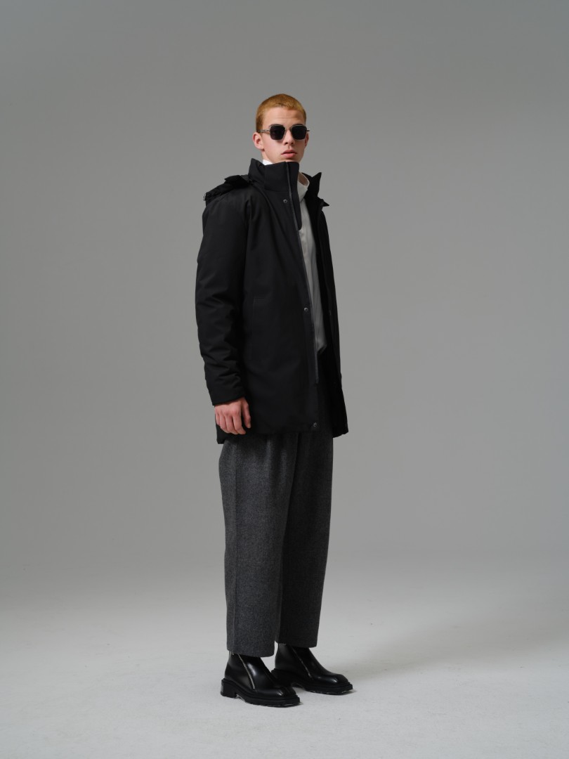 A contemporary longline parka designed for maximum coverage and a sleek, minimalist aesthetic. Built with a smooth, technical 100% polyester shell and full polyester insulation, this coat offers superb thermal warmth while its longer cut provides enhanced protection against wind and cold.